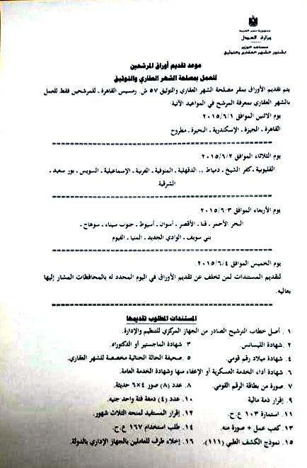 سيتم تسليم أوراق المعينين من محافظات «القاهرة- جيزة- إسكندرية- مطروح- بحيرة»، يوم الأثنين ، الموافق، 1-6-2015.