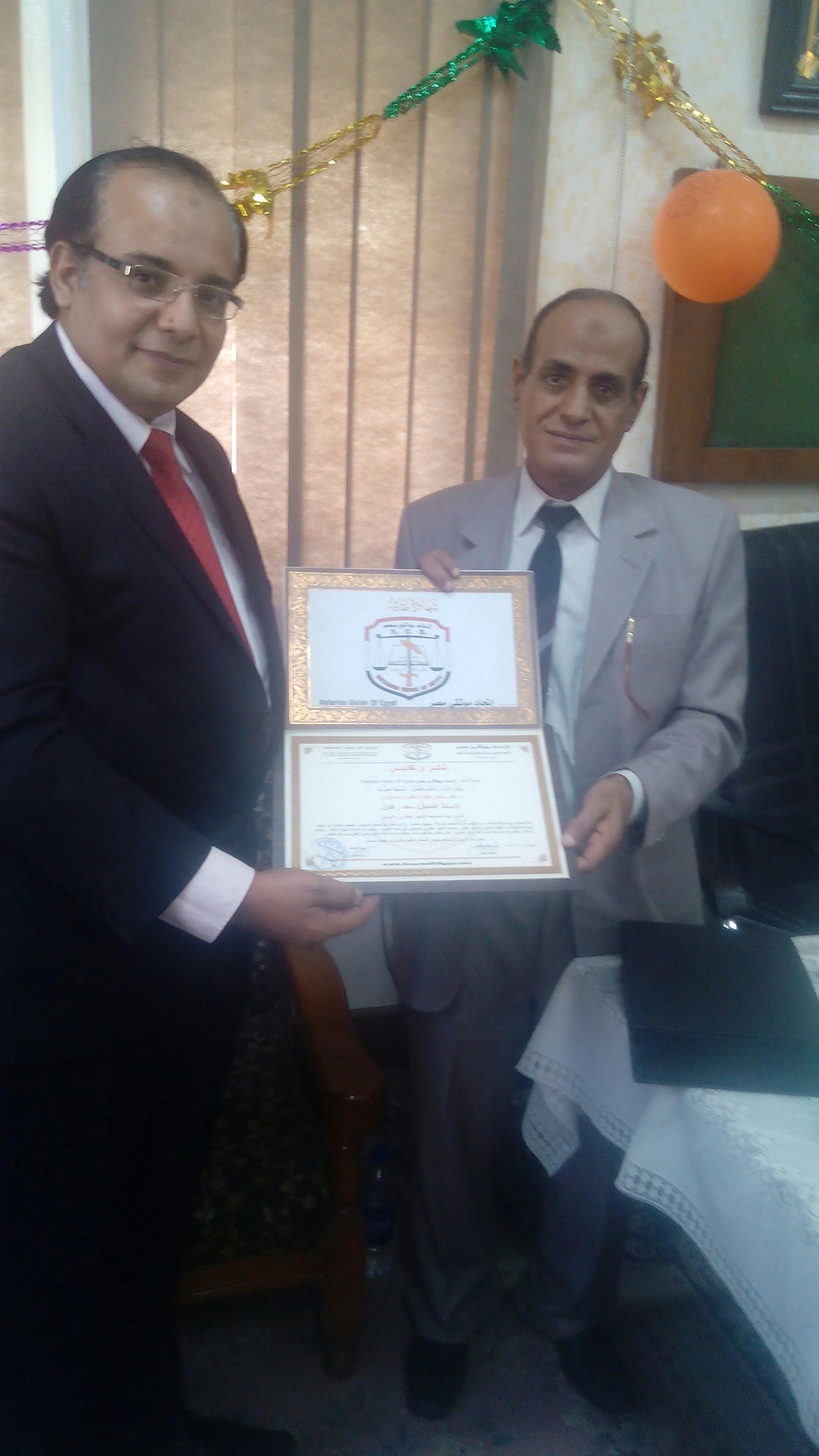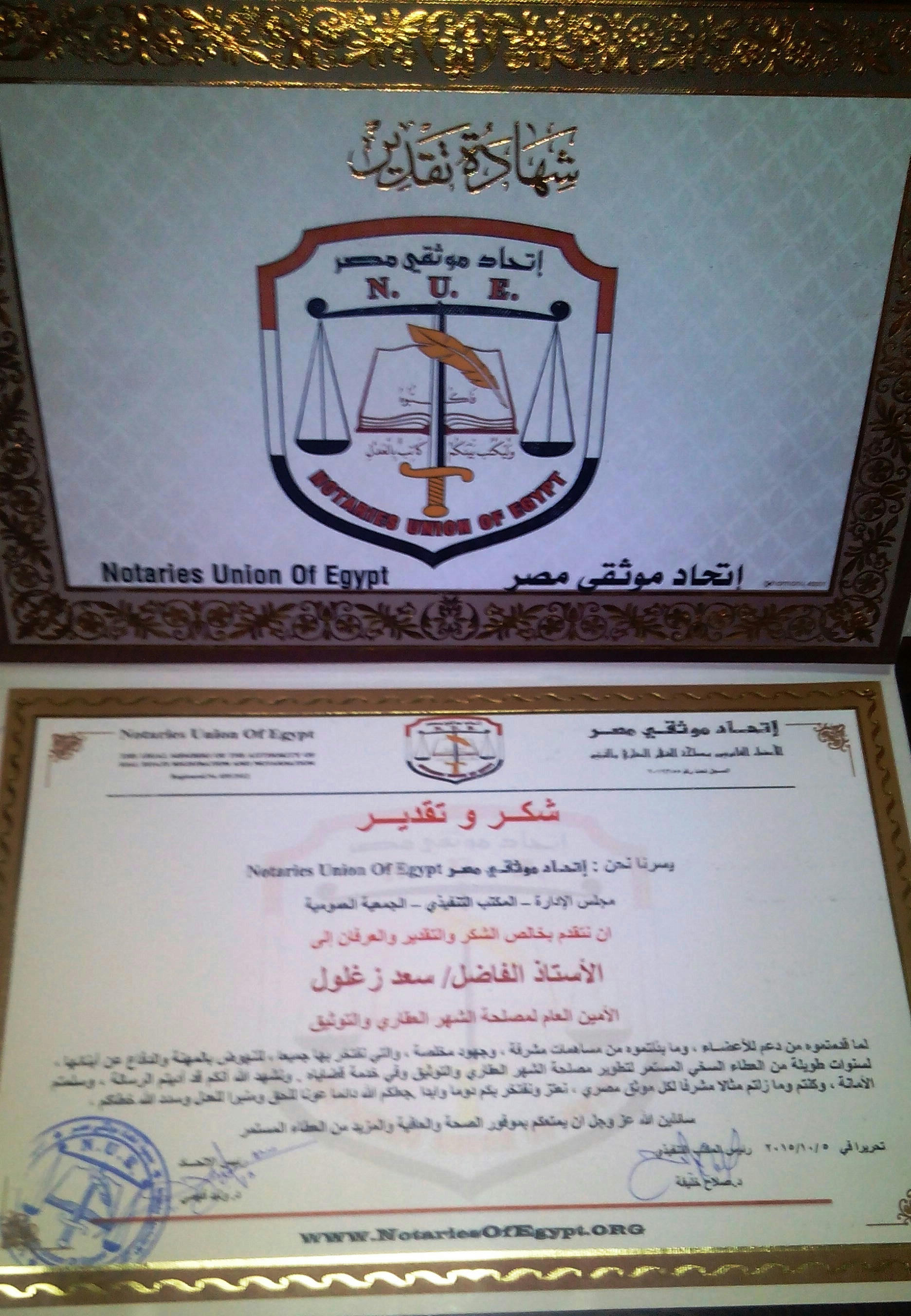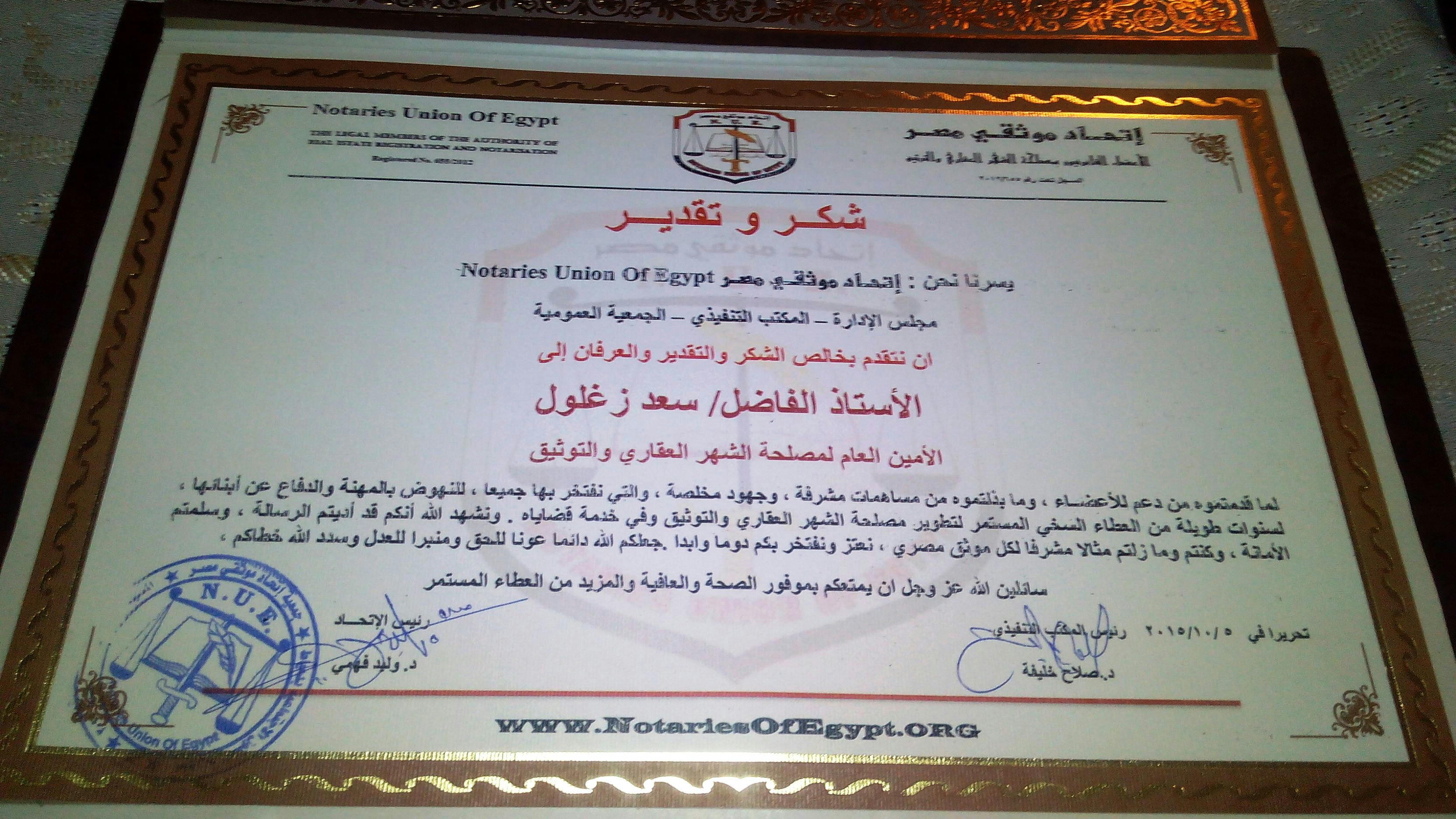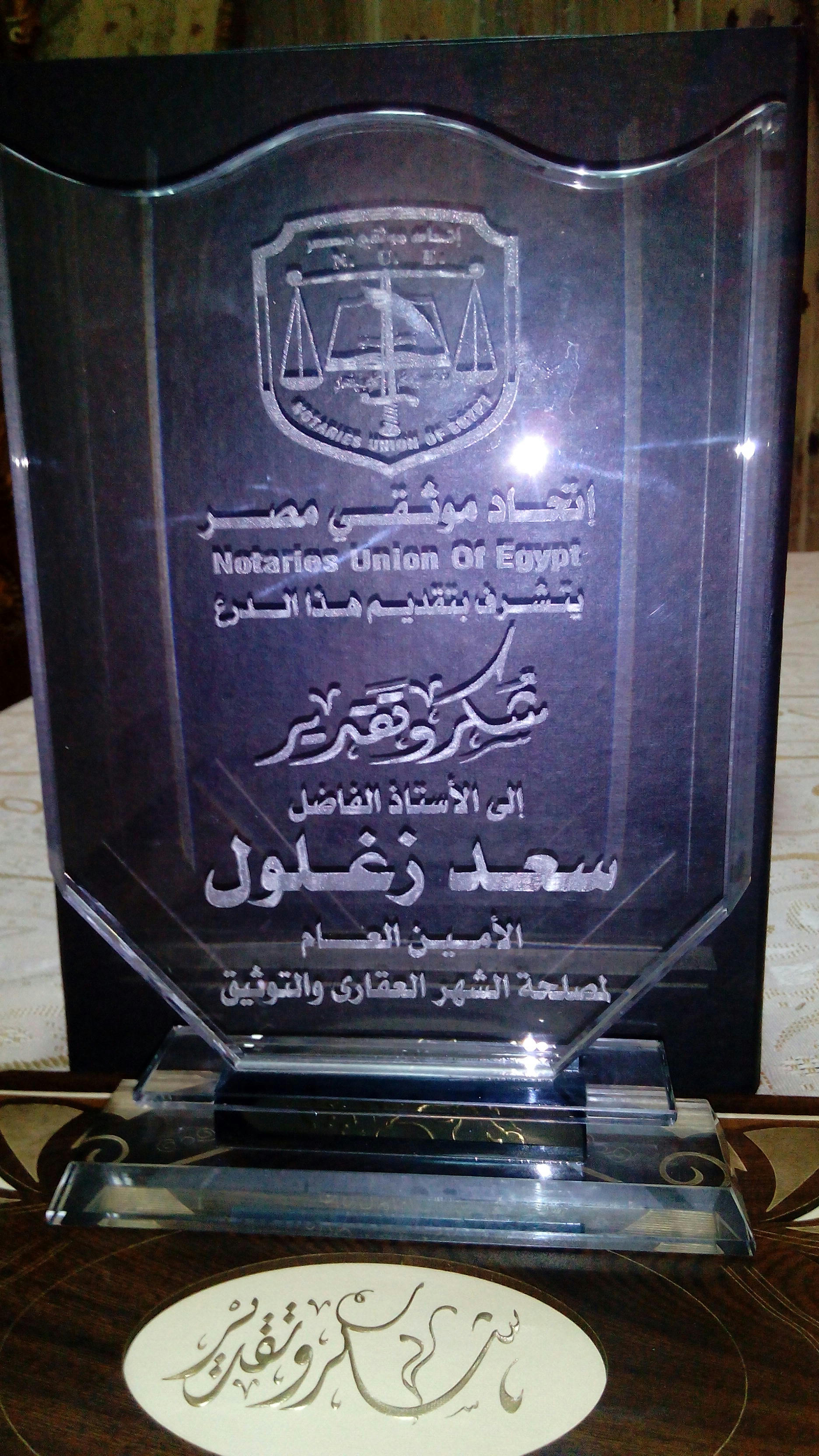 أنعقد أمس الاثنين الموافق الخامس من اكتوبر 2015 ، حفل تكريم السيد الاستاذ الفاضل / سعــد زغلـــول ، الأمين العام لمصلحة الشهر العقاري والتوثيق ، بديوان عام مصلحة الشهر العقاري والتوثيق بالقاهرة ،، بمناسبة بلوغ سيادته سن التقاعد الوظيفي ، وبحضور السادة الافاضل قيادات المصلحة السابقين والحاليين والسادة رؤساء ومديري الادارات بالمصلحة ، و لفيف من السادة الزملاء أعضاء وموظفين ، وبهذه المناسبة السعيدة يتقدم إتحاد موثقي مصر بـ شهادة شكر وتقدير ، ودرع الإتحـاد لأستاذنا الفاضل تقديرا متواضعا منا لدوره العظيم والمخلص والمشرف في الدفاع عن المهنة واعضائها .